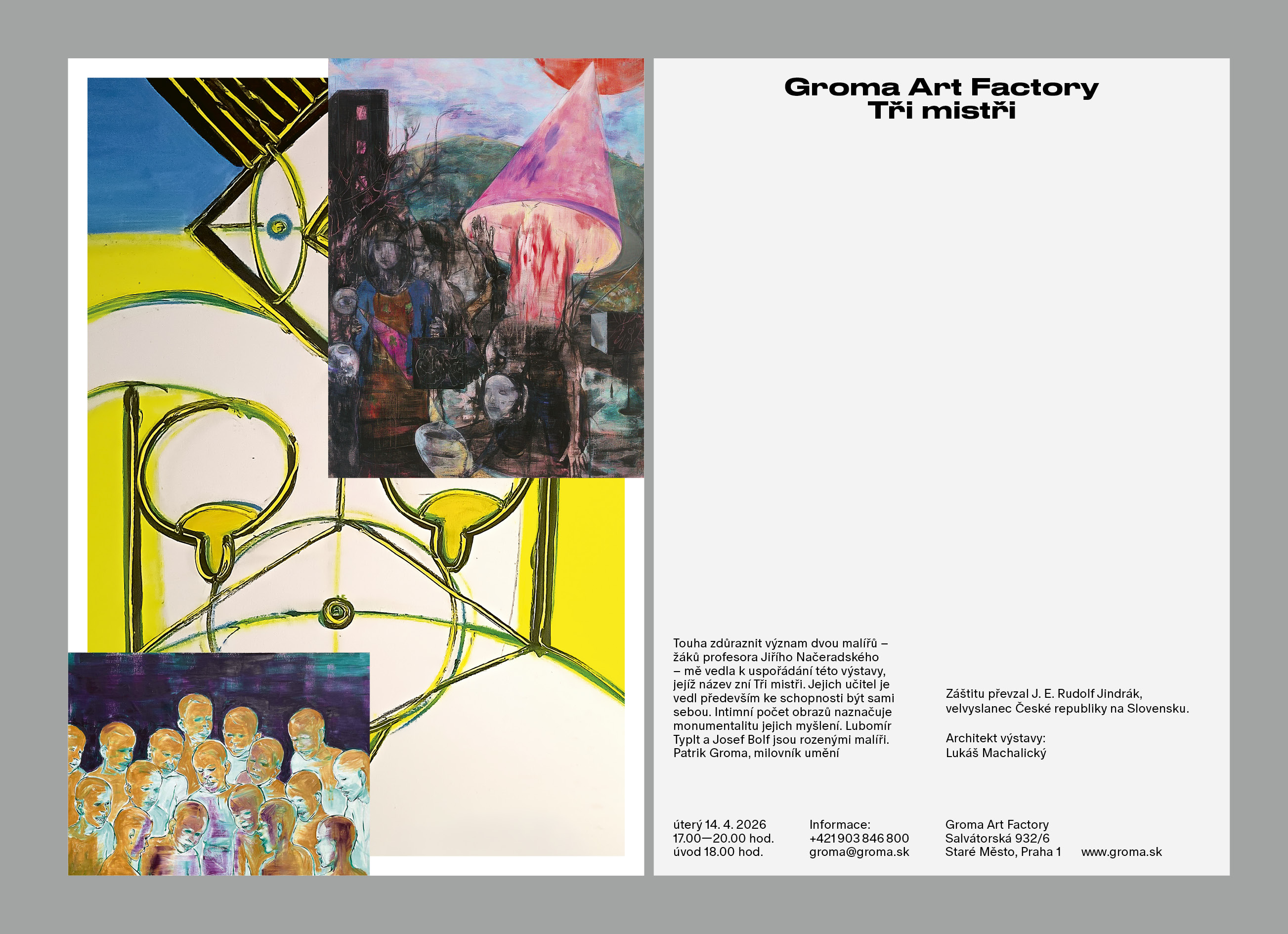 Praha sa tak opäť stáva miestom zaujímavého umeleckého počinu. Groma Art Factory srdečne pozýva širokú verejnosť, milovníkov výtvarného umenia aj odbornú komunitu na zrodenie novej umeleckej platformy – otvorenie galérie spojené s vernisážou výstavy „Tři mistři“, ktorá predstavuje tvorbu výrazných osobností súčasnej maľby.